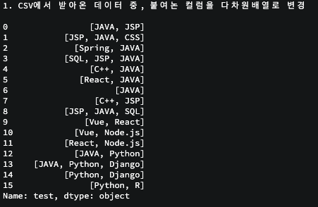 print('1. CSV에서 받아온 데이터 중, 붙여논 컬럼을 다차원배열로 변경 \n')