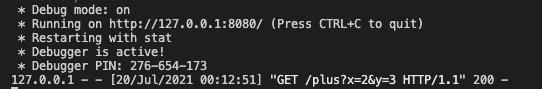해석하면 127.0.0.1:8080/plus 로 GET 요청을 보내면 Result 키에 args['x'] + args['y']값을 JSON으로 반환해준다.