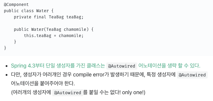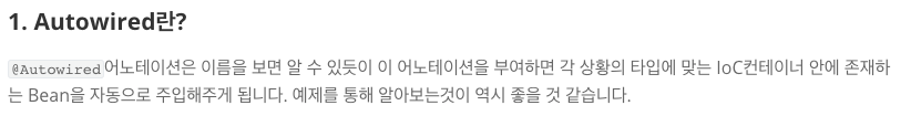 Interface 로 주입받는 메소드를 정의한다. 이 방식은 이번에 조사하면서 처음 알게 되었고 실제로 사용해본 적이 없어 자세히 적기는 조심스럽다. 예시를 봐도 이점이 명확하게 보이지 않아 좀 더 공부를 하고 내용을 채워보려 한다.